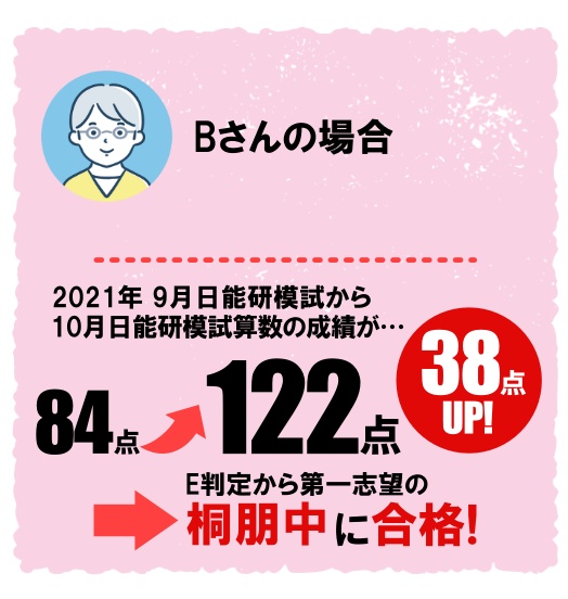 志望校に狙いを定めマンツーマンでしっかり指導していただきました。第一志望の中学校に合格したばかりでなく、特待枠にも入ることができました。と同時に勉強することが日常の習慣となったことが何よりも嬉しいです。ありがとうございました。