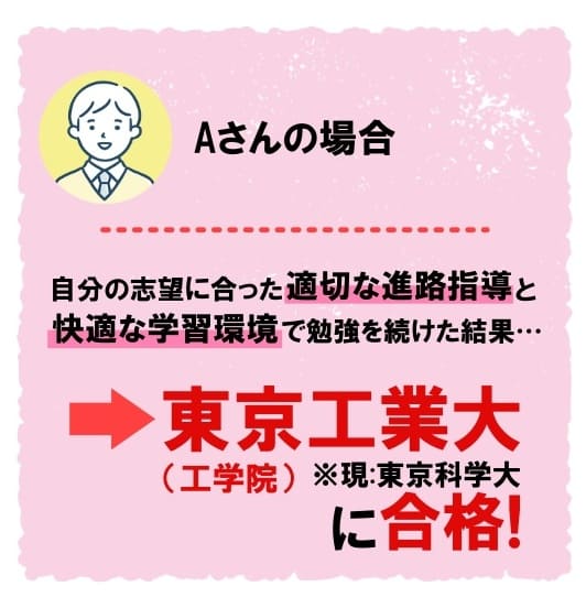 一人ひとりにあった丁寧な指導をしてくださり、受験期間中も前向きな言葉をかけてくださり、手厚いサポートを受けられたことがよかったです。
